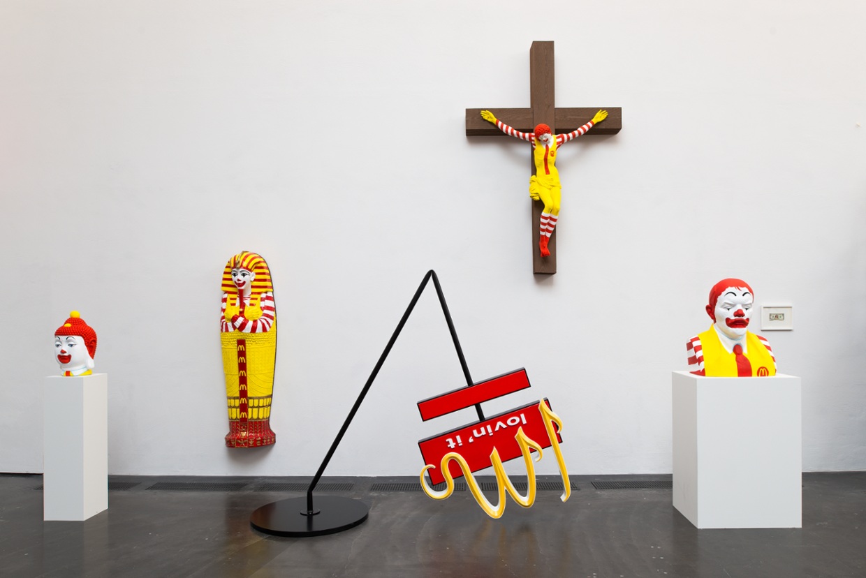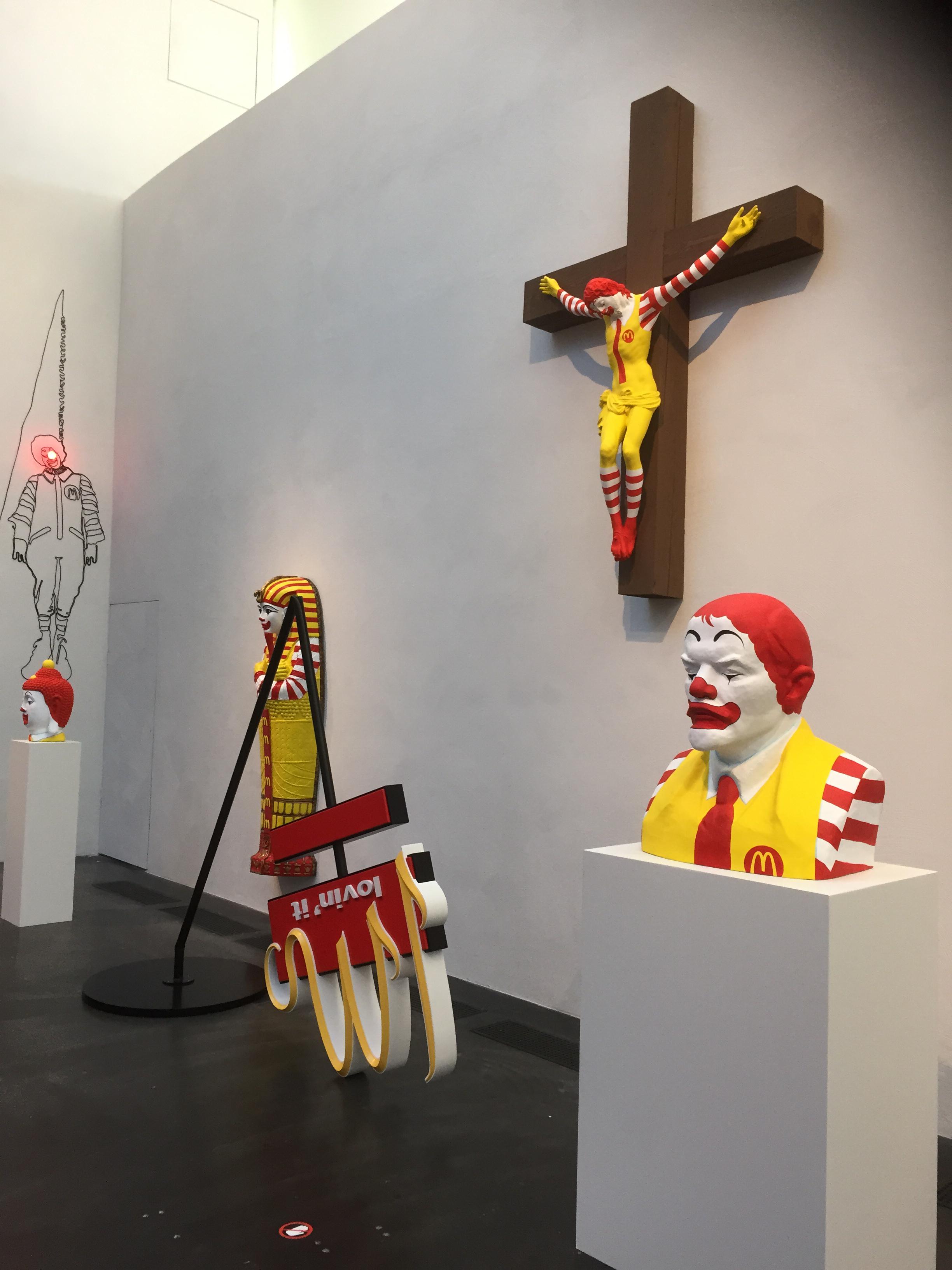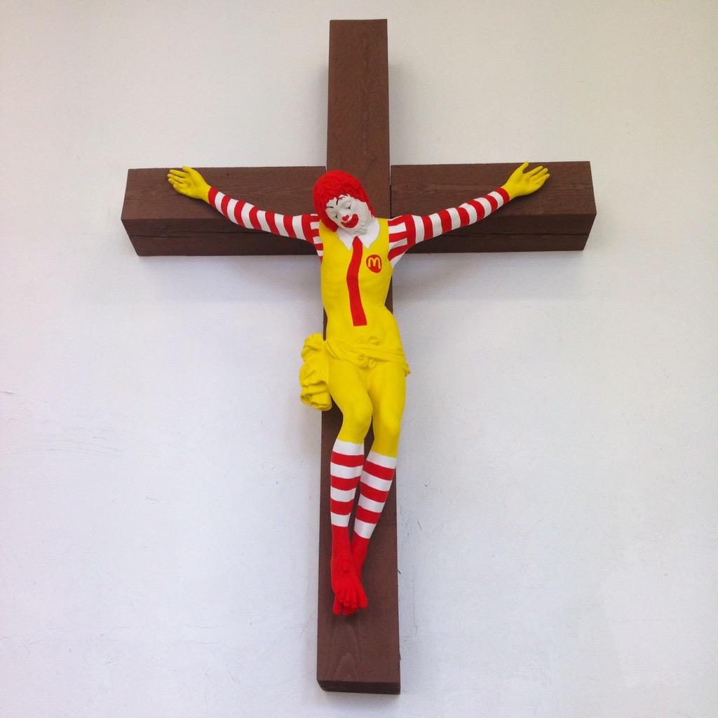 Το φυσικού μεγέθους άγαλμα του εσταυρωμένου Roland McDonald υποτίθεται ότι συμβολίζει την αιρετικού τύπου λατρεία του καπιταλισμού και σύμφωνα με τον διευθυντή του Μουσείου στη Χάιφα, βρισκόταν ανάμεσα στα εκθέματα πολλούς μήνες χωρίς να εκδηλωθεί καμιά διαμαρτυρία.