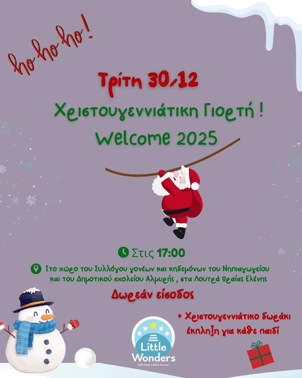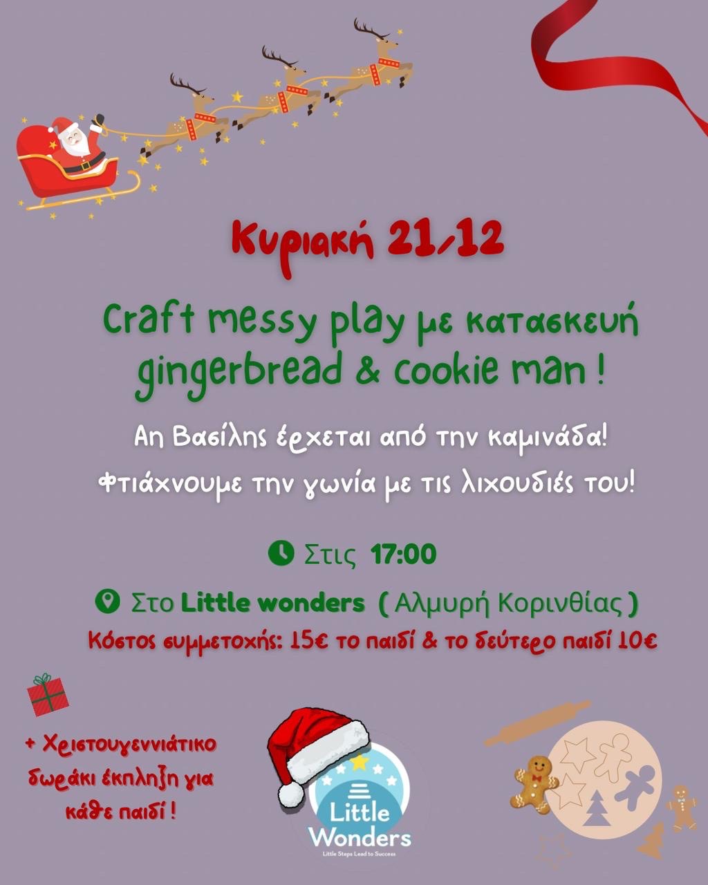 Το Little Wonders – Παιδιατρικό Κέντρο Στοχευμένων Θεραπειών Ομιλίας και Έργου μεταμορφώνεται σε ένα πραγματικό εργαστήριο του Βόρειου Πόλου. Πόρτες που ανοίγουν σε πολύχρωμες γιρλάντες, μυρωδιές από μπισκότα gingerbread, ήχοι που μοιάζουν να έρχονται από μακριά και μικρά ξωτικά που καλούν τα παιδιά να γίνουν μέρος της δικής τους γιορτινής ιστορίας.