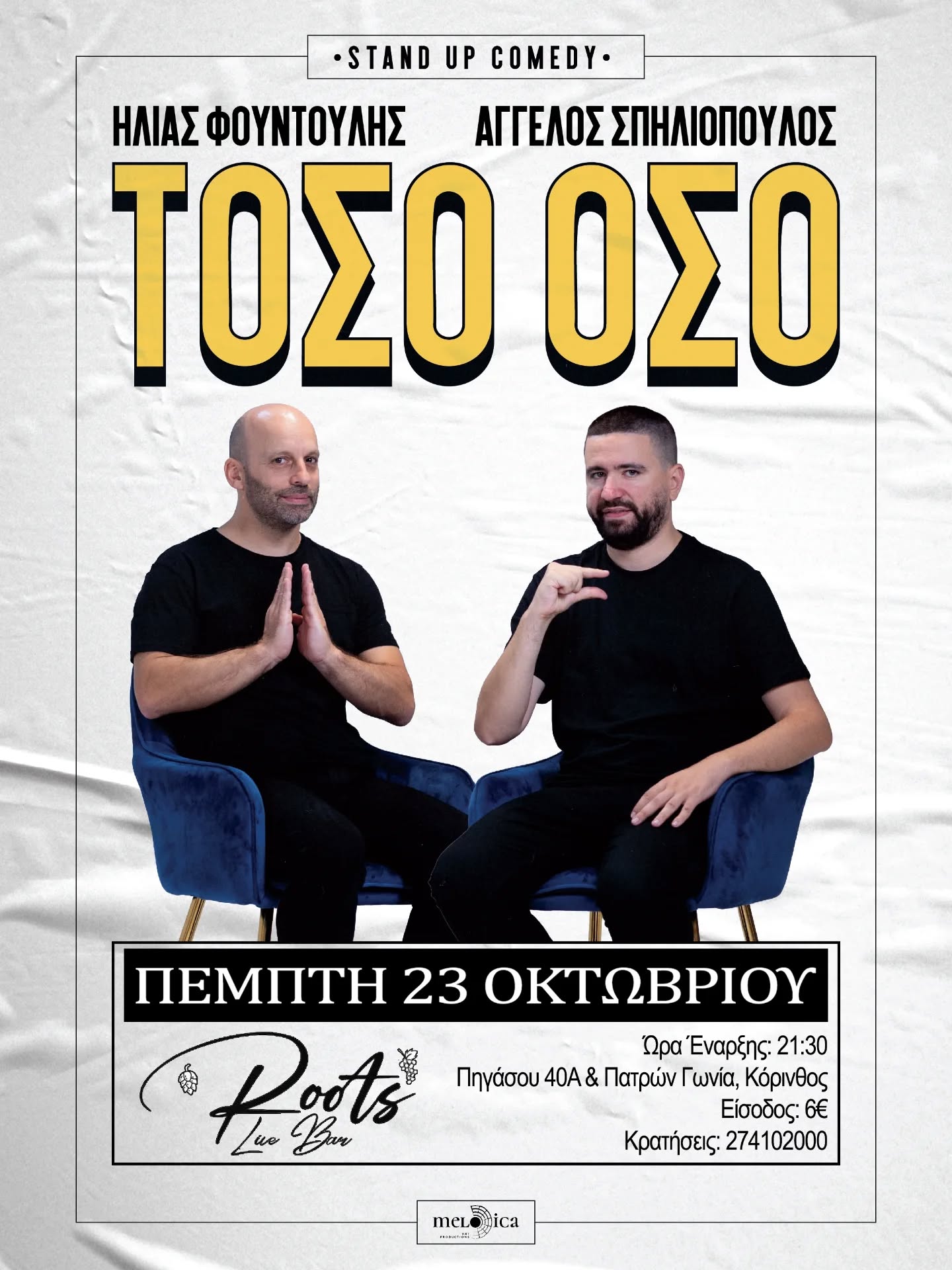 Όταν ο Άγγελος και ο Ηλίας γνωρίστηκαν, ήταν Τρίτη απόγευμα και ψιλόβρεχε. Ένωθηκαν με τα ανίερα δεσμά των λογοπαιγνίων το 2020, έφτιαξαν την παράσταση Double Impact που παίχτηκε 141 φορές σε Ελλάδα και Ευρώπη. Αποφάσισαν να συνεχίσουν μαζί σε ένα ακόμα double bill με τον τίτλο ΤΟΣΟ ΟΣΟ.