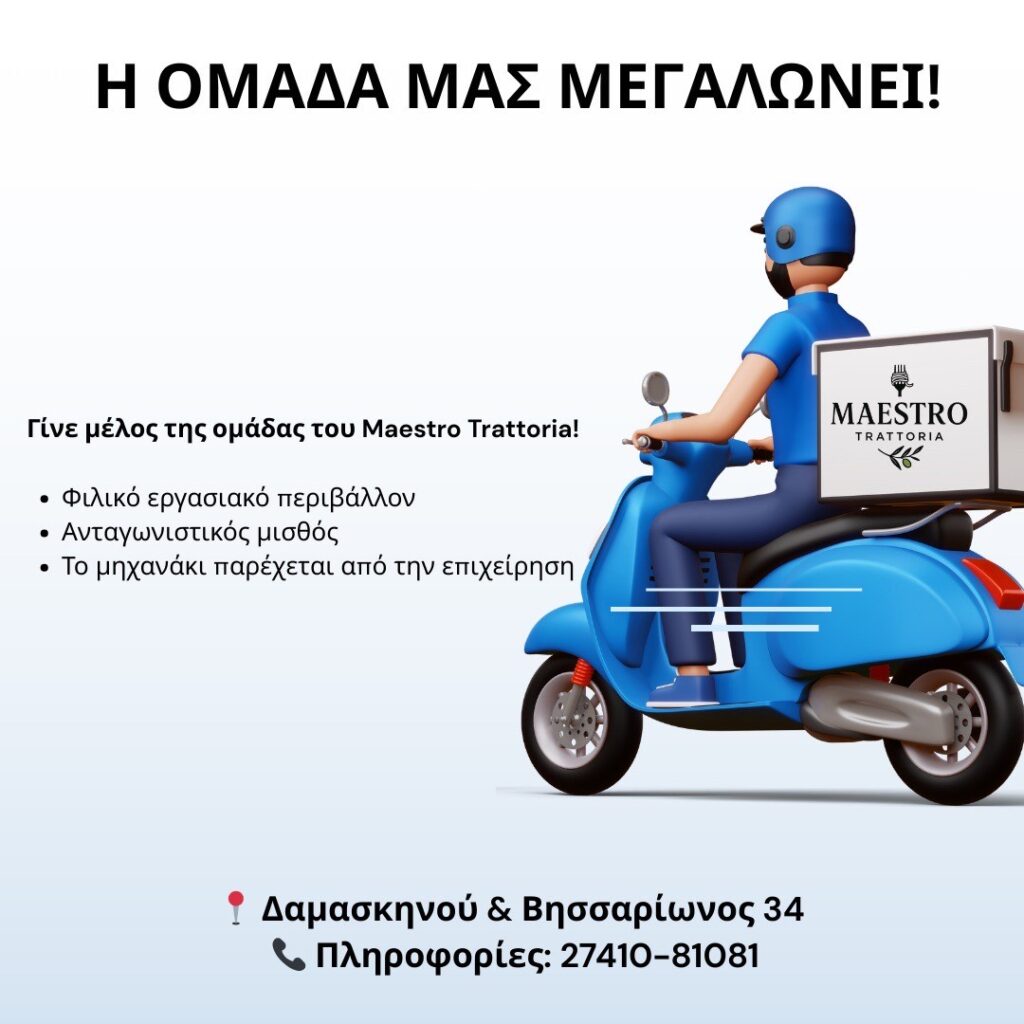 Το Maestro Trattoria επεκτείνει την ομάδα του και αναζητά νέους συνεργάτες για τη θέση του διανομέα! Αν θέλεις να εργαστείς σε ένα φιλικό περιβάλλον, με ανταγωνιστικές αποδοχές, αυτή είναι η ευκαιρία σου.