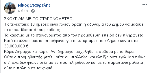 Mε σημερινή του ανάρτηση στο facebook ο δημοτικός σύμβουλος και υποψήφιος δήμαρχος Κορίνθου Νίκος Σταυρέλης αναφέρεται στην κατάσταση που έχει δημιουργηθεί σχετικά με την δυσκολία που φαίνεται να υπάρχει στην αποκομιδή των σκουπιδιών.