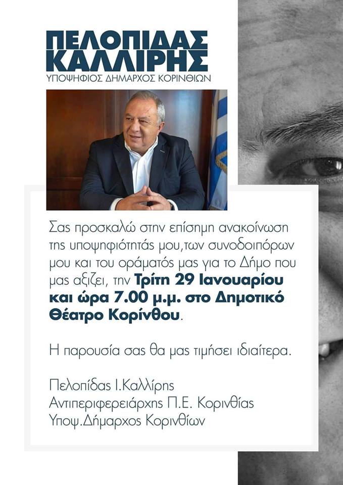 Συμπορεύομαι με τον Πελοπίδα Καλλίρη και στηρίζω την υποψηφιότητά του για το Δήμο Κορινθίων, βέβαιος για τις ικανότητές του σε όλα τα επίπεδα και τις ανάγκες Διοίκησης του τόπου.