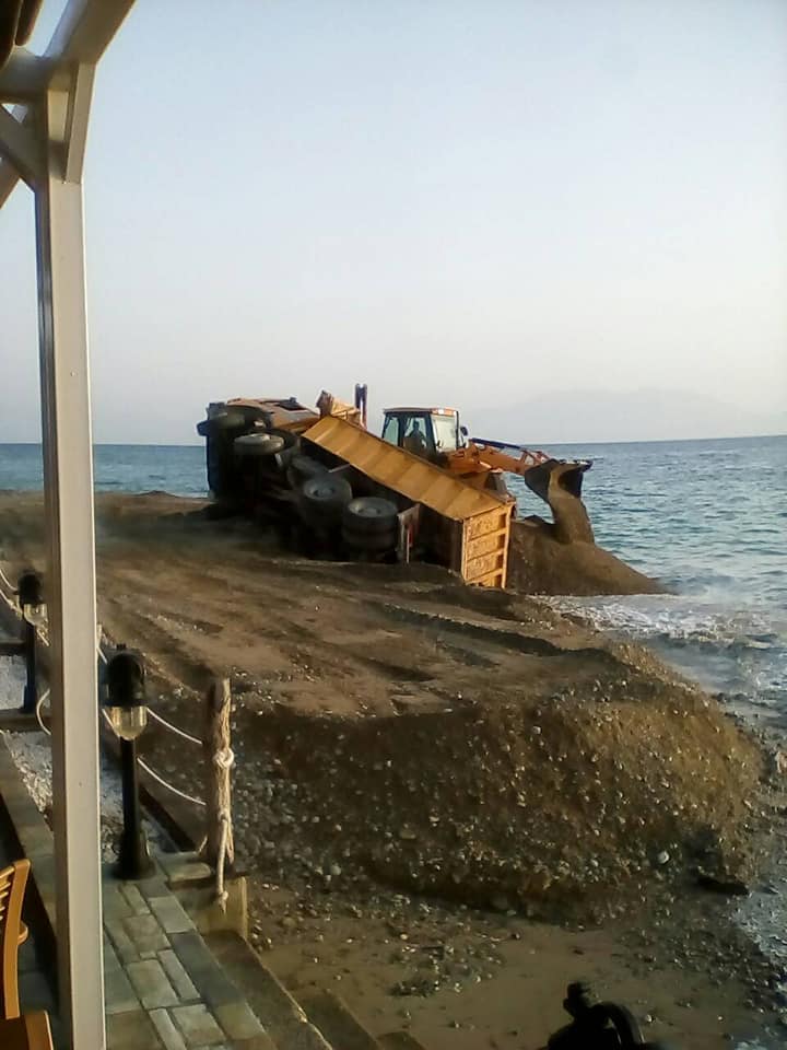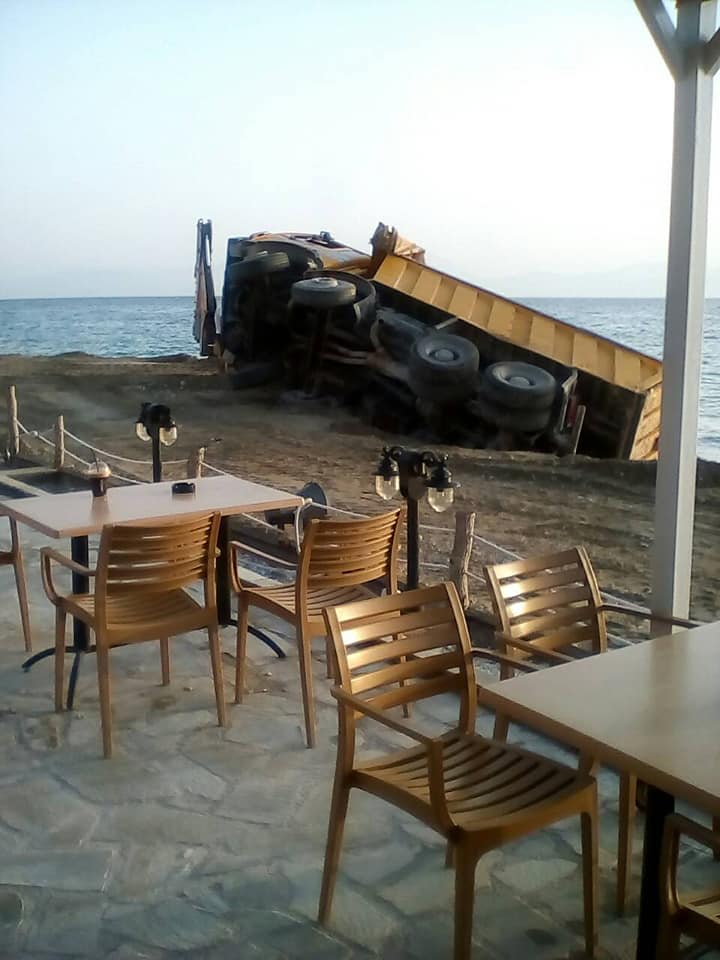 Απίστευτα πράγματα στο Ξυλόκαστρο και συγκεκριμένα κάτω ακριβώς από το Τουριστικό Περίπτερο, καθώς εκεί ακριβώς είχε τοποθετηθεί χώμα ώστε να συνεχίσει να υπάρχει η ακτή, αλλά αρχικά αυτό αποδείχθηκε λανθασμένη επιλογή, μιας και το χώμα έγινε αναμενόμενα λάσπη, ενώ το πρωί της Τετάρτης είχαμε και ένα φορτηγό που εκτελούσε εργασίες στο σημείο, το οποίο αναποδογύρισε, χωρίς ωστόσο να υπάρξει τραυματισμός.