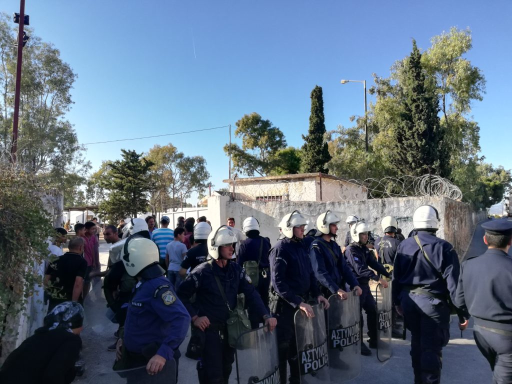 Από πολύ νωρίς ισχυρές αστυνομικές δυνάμεις είχαν αποκλείσει τον χώρο έξω από τη δομή, ενώ ειρηνική ήταν η συγκέντρωση αλληλεγγύης για τους πρόσφυγες και τους μετανάστες.