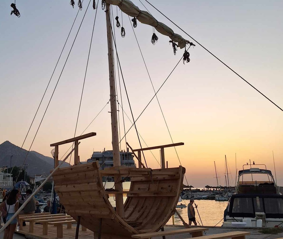 “Διεπιστημονικής Ομάδας Ναυτικής Αρχαιολογίας Ξυλοκάστρου” Ομιλία της Δρος Δήμητρας Καμαρινού για την Ναυτική Ιστορία του Λιμανιού των Αριστοναυτών, Αναπαράσταση μυκηναϊκού καρνάγιου με τα ανακατασκευασμένα χάλκινα εργαλεία ναυπηγικής της Δ/ρος Έλενας Μαραγκουδάκη