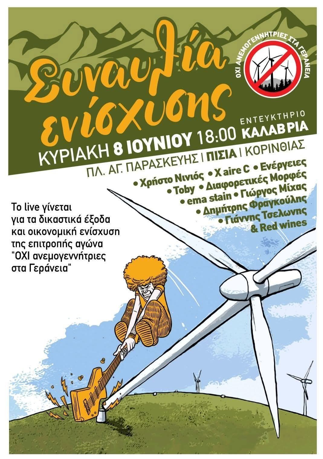 Την Κυριακή 8 Ιουνίου στις 18:00, στην Πλατεία Αγίας Παρασκευής στα Πίσια Κορινθίας, διοργανώνεται μεγάλη συναυλία ενίσχυσης από την Επιτροπή Αγώνα «Όχι ανεμογεννήτριες στα Γεράνεια».