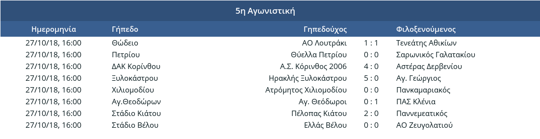 Επεσε η αυλαία της 5ης αγωνιστικής του πρωταθλήματος της Α’ Κατηγορίας Κορινθίας και βρήκε μόνη στην κορυφή της βαθμολογίας την Κόρινθο 2006 (4-0 τον Αστέρα Δερβενίου – αήττητη μέχρι τώρα με σερί 5-0-0). Στο -2 το Ζευγολατιό που έμεινε στο μηδέν με την Ελλάς Βέλου εκτός έδρας, σε ισοβαθμία με τον Πέλοπα Κιάτου, ο οποίος πήρε πολύ σημαντική νίκη 2-0 επί του Παννεμεατικού. Ακόμα ένα στραβοπάτημα για τον ΑΟ Λουτράκι που ήρθε ισόπαλος 1-1 εντός έδρας με τον Τενεάτη Αθικίων και βρίσκεται στην 5η θέση της κατάταξης.
